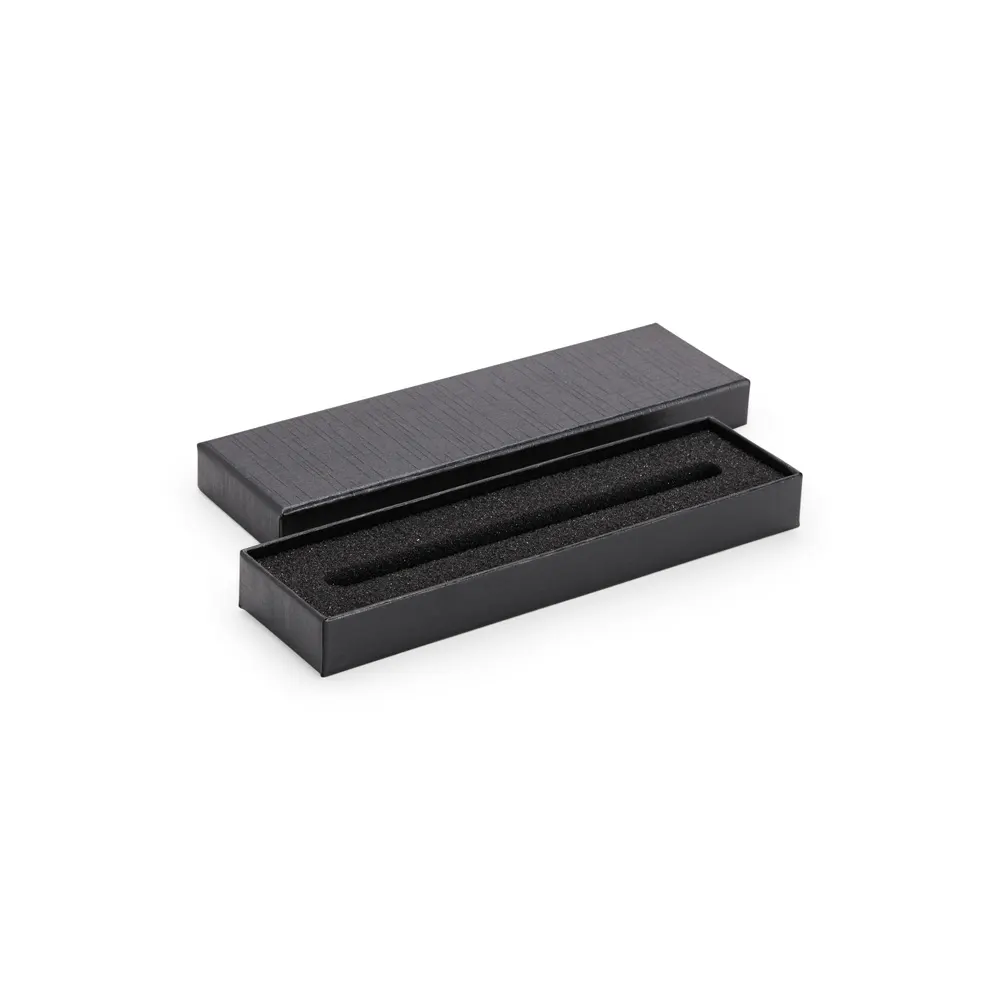 Descrição: Estojo feito em papelão e revestimento interno removível de camada dupla em espuma com espaço para acomodar uma caneta ou lapiseira.