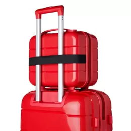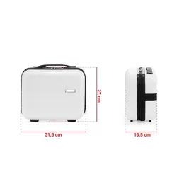 Descrição: Frasqueira de plástico (casca dura). Possui compartimento interno, elástico de segurança, alça para encaixe em malas de viagem e 4 apoios para maior estabilidade. Acompanha placa de personalização.