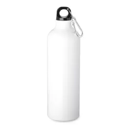 Garrafa em alumínio, tampa de plástico com mosquetão colorido. Capacidade de 750ml, com pintura metálica.