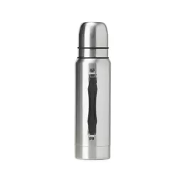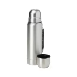 Descrição: Garrafa térmica de inox com parede dupla e tampa dupla, capacidade de 1 litro. Com alça plástica para transporte, a garrafa contém duas tampas utilizáveis como copos.