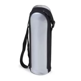 Garrafa térmica 500ml em inox com tampa rosqueável, tampa interna em plástico resistente(basta um clique para abrir ou fechar). Acompanha capa protetora de couro sintético com alça de nylon.