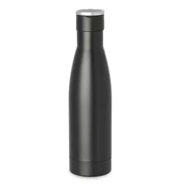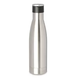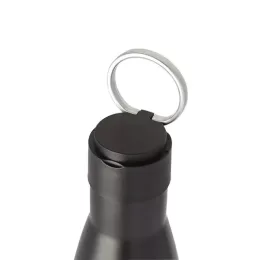 Garrafa térmica em aço inox isolada a vácuo com parede dupla, tampa de plástico com alça de transporte de aço inoxidável. Com capacidade de até 500ml.