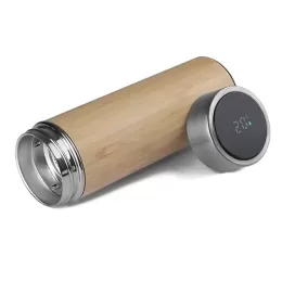 Descrição: Garrafa térmica inox 400ml de parede dupla com acabamento em bambu, contém infusor de bebida e display LED com termômetro digital na tampa para indicar a temperatura do líquido. Conserva temperatura quente ou fria.