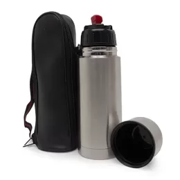 Descrição: Garrafa térmica 350ml em inox com tampa rosqueável, tampa interna em plástico resistente. Acompanha capa protetora de couro sintético com alça de nylon.