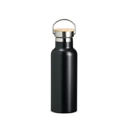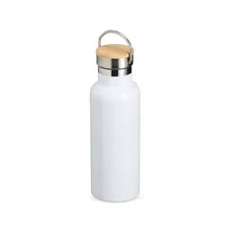 Descrição: Garrafa de inox com capacidade de 500ml, tampa em inox com detalhe em bambu e alça de transporte.