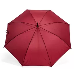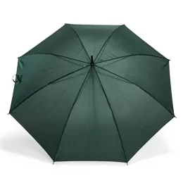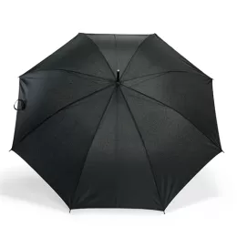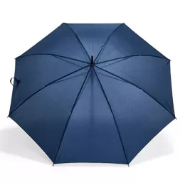 Guarda-chuva com abertura automática, estrutura em aço e 8 varetas em fibra de vidro. Possui pegador de madeira com alça de nylon e botão de acionamento.