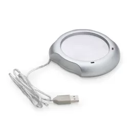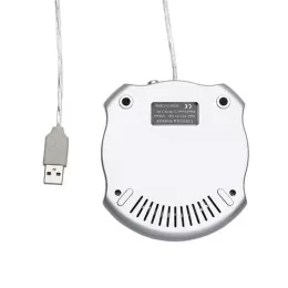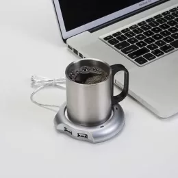 Hub e aquecedor de caneca. Parte aquecedora central em inox, para acionar basta apertar o botão na parte traseira da peça(quando estiver acesa a luz vermelha está aquecendo, luz verde significa apenas conetado). Material plástico resistente, possui quatro entradas USB e parte inferior com borrachas anti deslizantes. Entrada DC5.0V 500 – 1000mA e potência: 2.5W DC5.0V.