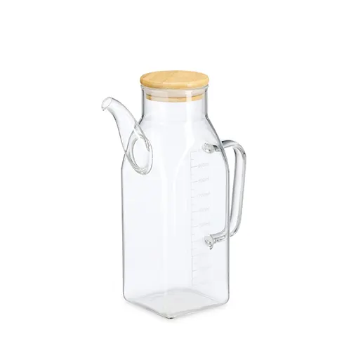 Descrição: Jarra de vidro borossilicato, material resistente à oscilações de temperatura. Com capacidade para até 1 litro, possui marcação de capacidade no corpo do recipiente e tampa de bambu com anel de vedação. Acompanha tampa protetora para o bico em silicone.