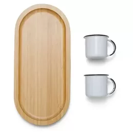 DESCRIÇÃO: Conta com bandeja em bambu para servir com formato oval e duas canecas em alumínio esmaltado branco.