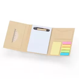 Bloco de Anotações Ecológico, material em kraft. Possui notas autoadesivas, aproximadamente 25 folhas, bloco autoadesivo amarelo com aproximadamente 25 folhas, compartimento para guardar anotações, uma régua em material plástico de 12 cm, caneta de papelão e bloco grande com aproximadamente 100 folhas.