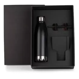 DESCRIÇÃO: Conta com caderno para anotações preto com capa dura, caneta esferográfica em ABS preta e garrafa em aço Inox preta com tampa rosqueável e capacidade total de 750ml.