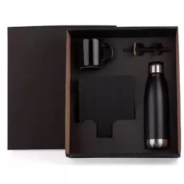 DESCRIÇÃO: Kit composto por garrafa em aço Inox preta com tampa rosqueável, caneca em cerâmica preta, caderno para anotações wire-o preto com capa dura revestida em percalux linho e caneta esferográfica em ABS preta.