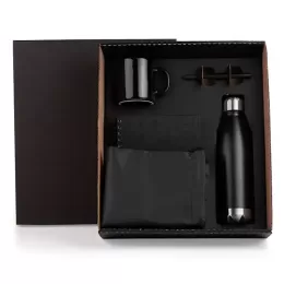 DESCRIÇÃO: Kit composto por mochila sacola em Nylon 420 preta, garrafa em aço Inox preta com tampa rosqueável, caneta esferográfica em ABS preta e caneca em cerâmica preta.