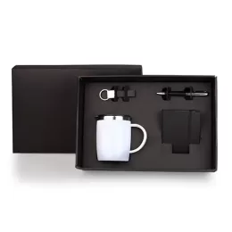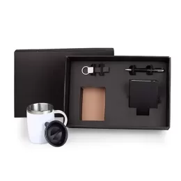 DESCRIÇÃO: Kit composto por caneca em aço Inox com revestimento de Poliestireno branco, caderno para anotações preto com capa dura, caneta confeccionada em metal cromado brilhante com corpo revestido em material sintético preto texturizado e chaveiro em metal e material sintético preto.