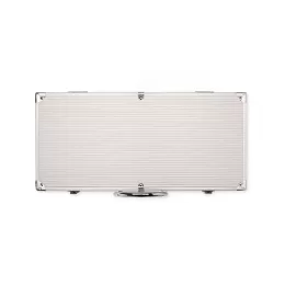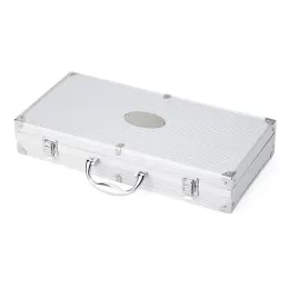 Kit churrasco 10 peças em maleta de alumínio com travas de segurança e placa central para personalização. Contém: espátula, pegador, escova para grelha, faca, pincel, garfo e quatro espetos, parte interna da maleta com revestimento em TNT e suportes de velcro para fixação das peças.
