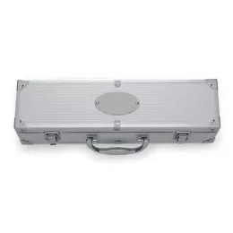 Kit churrasco 3 peças em maleta de alumínio com relevo. Possui: faca, garfo e pegador em inox(todas peças possuem proteção plástica) detalhes em metal nas bordas da maleta, duas dobradiças na parte inferior, uma alça e duas presilhas para travar/abrir maleta. Parte interna revestida de tecido tnt e velcro para guardar as peças.” observação: Maleta 11,9 cm x 37 cm x 7,8 cm – Faca 32,5 cm x 2,4 cm – Garfo 34,6 cm x 3,3 cm – Pegador 34,3 cm x 6 cm