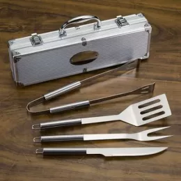 Descrição: Kit churrasco 4 peças em maleta de alumínio com travas de segurança, contém: espátula, pegador, garfo e faca em inox. Parte interna da maleta com revestimento em tnt e suportes de velcro para fixação das peças.