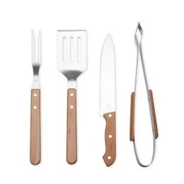 Descrição: Prepare churrascos memoráveis e deliciosos com o nosso kit com quatro peças essenciais: espátula, garfo, pegador e faca de 7 polegadas, todas em aço inox com cabos de madeira, acomodadas em um estojo de nylon que facilita o armazenamento e transporte. Para maior exclusividade, acompanha uma plaquinha metálica personalizável com verso autoadesivo.