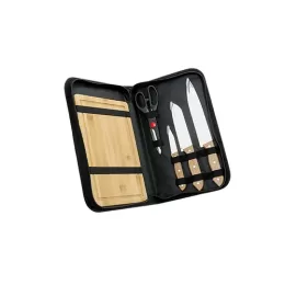 Descrição: Kit churrasco 5 peças em estojo de nylon com alça e parte interna com elástico para fixar as peças. Possui tábua de madeira com canaleta, três facas de corte e tesoura.