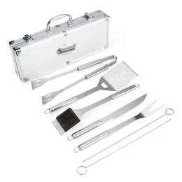 Descrição: Kit churrasco 7 peças em maleta de alumínio com relevo. Possui: pegador, espátula, duas chairas, faca, escova para limpeza(acompanha protetor plástico), faca e garfo em inox. Detalhes em metal nas bordas da maleta, duas dobradiças na parte inferior, uma alça e duas presilhas para travar/abrir maleta. Parte interna revestida de tecido tnt e velcro para guardar as peças.
