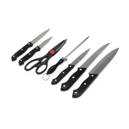Descrição: O churrasco vai ficar ainda melhor com o nosso kit de 7 peças em inox, incluso: uma faca de chef de 7 polegadas; uma faca de desossa de 7 polegadas; uma faca para fatiar de 4,5 polegadas, uma faca de descascar de 4,5 polegadas, uma faca de legumes de 3 polegadas; uma chaira, essencial para manter as facas sempre afiadas; e uma tesoura multiuso para cortar alimentos, legumes, verduras e carnes, todas as peças possuem cabo plástico. Além disso, a tesoura possui pequenos dentes entre os cabos que funcionam como um quebra-nozes. O kit também acompanha uma plaquinha de metal, permitindo a personalização para dar um toque único ao estojo e ainda mais estilo quando for preparar aquele churrasco de respeito.