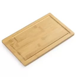 Kit Churrasco com 3 peças: Garfo, Faca com 31,7 cm, ambos com cabos de madeira e lâminas em aço inox, Tábua de bambu com 1,2 cm de espessura.