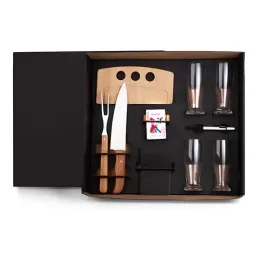 DESCRIÇÃO: Kit para churrasco, cerveja e truco. Acompanha tábua com três furos em bambu; faca 8” e garfo trinchante em bambu/inox; quatro copos de cerveja em vidro; jogo de cartas; bloco de anotações e caneta esferográfica. Tábua confeccionada com tripla camada invertida, para dar maior durabilidade e não deformar com o passar do tempo.