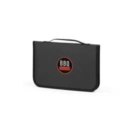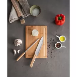 Kit churrasco em estojo de PU e 210D. Composto por tábua em bambu e 7 utensílios em aço inox e madeira de Seringueira: faca japonesa, faca chefe, garfo, pinça, faca pequena, afiador e pincel. Próprio para contato com alimento. Estojo: 250 x 370 x 45 mm | Tábua: 300 x 200 x 11,6 mm