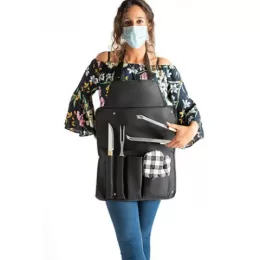 Kit churrasco composto por 4 utensílios: faca, garfo e pinça em aço inox e madeira de Seringueira e uma luva de cozinha. O estojo dobrável em 600D pode ser convertível em avental para sua proteção. Próprio para contato com alimento. Dobrado e fechado: 130 x 480 mm