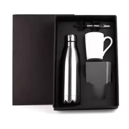 DESCRIÇÃO: Conta com garrafa de 750 ml em aço Inox na cor prata, caneca em cerâmica branca com capacidade de 230 ml, caderno para anotações cinza com capa dura e caneta esferográfica em ABS prata.