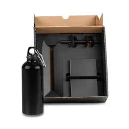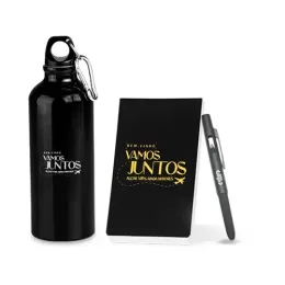 DESCRIÇÃO: Conta com garrafa em alumínio 500ml, caneta esferográfica em ABS preta e bloco para anotações.