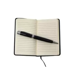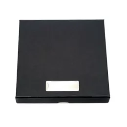 Kit executivo 2 peças em estojo de papelão com tampa e parte interna revestida de espuma. Contém: caneta metal preta com anel e detalhes em prata, caderneta tipo moleskine em couro sintético com aproximadamente 80 folhas amarelas pautadas. Acompanha placa metálica para gravação.