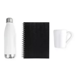 DESCRIÇÃO: Conta com garrafa em aço inox branca com tampa rosqueável, caderno para anotações wire-o preto com capa dura e caneca em cerâmica branca.