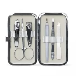 Descrição: Kit manicure 6 peças em estojo de couro sintético. Possui: lixa, pinça, empurrador de cutícula, cortador de cutícula, tesoura e cortador de unha. Parte interna revestido de veludo com suporte de couro para fixar as peças. Para abrir o estojo basta apertar o botão central. OBS.: APENAS NA COR PRETA O VELUDO INTERNO É PRETO!