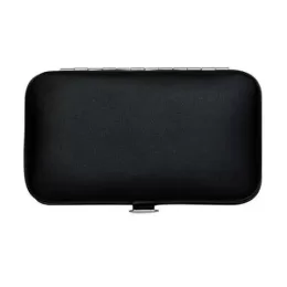 Kit manicure 6 peças em estojo de couro sintético. Possui: lixa, pinça, empurrador de cutícula, cortador de cutícula, tesoura e cortador de unha. Parte interna de plástico com suporte de couro para fixar as peças. Para abrir o estojo basta apertar o botão central.