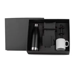 DESCRIÇÃO: Conta com mochila sacola em nylon, garrafa em aço inox 750ml, caneca em cerâmica, caneta plástica com tampa e ponta touch e caderneta para anotações.