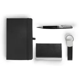 DESCRIÇÃO:Kit office. Conta com uma caderneta de 80 folhas preto; porta-cartão em material sintético preto texturizado e metal cromado para aproximadamente 20 cartões; caneta esferográfica em metal com corpo revestido em material sintético preto texturizado; chaveiro em metal com material sintético preto.