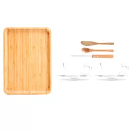 Uma gravação a Laser na bandeja, nas xícaras e na tampa da caixa.