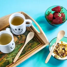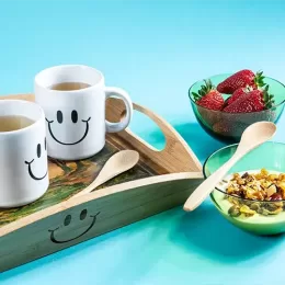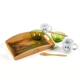 DESCRIÇÃO: Kit para café da manhã. Conta com bandeja e duas colheres em bambu, duas xícaras em cerâmica e duas tigelas de vidro.