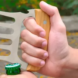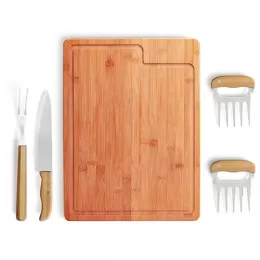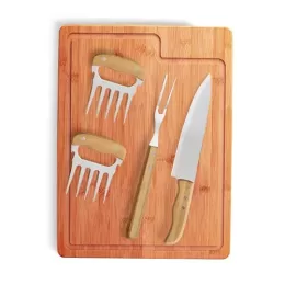 Conjunto para Churrasco em Bambu/Aço Inox. Conta com tábua em Bambu; Faca 8”, garfo trinchante e 2 garfos 5 dentes com abridor de garrafa em Bambu/Inox.