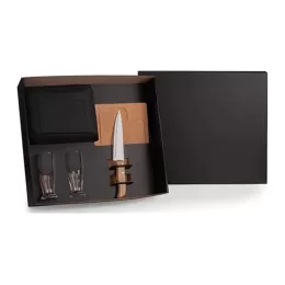 RECOMENDAÇÃO DE PERSONALIZAÇÃO: Uma gravação a Laser na tábua, na lâmina da faca e nos copos.