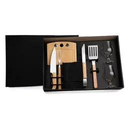 DESCRIÇÃO: Kit para churrasco/hambúrguer. Conta com tábua em Bambu com três furos; Faca 8” e garfo em Bambu/Inox; pegador e espátula perfurado em aço Inox/Madeira; Avental em Brim preto; dois ramekins; duas taças para cerveja.