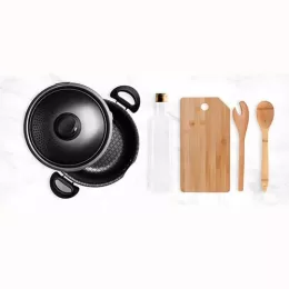 Descrição: Kit para macarrão Conta com tábua, pegador 30cm e colher 30cm em Bambu; espagueteira com tampa em Inox antiaderente; garrafa *500ml* para azeite. (Acompanha tampa para usar com a panela como pipoqueira também).