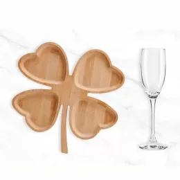 Descrição: Kit para Petisco e Champagne. Conta com petisqueira formato de trevo em Bambu; uma taça para champagne em Vidro; espaço para garrafa com palha. NÃO ACOMPANHA GARRAFA. Estão perfeitamente acomodados em uma caixa para presentear.