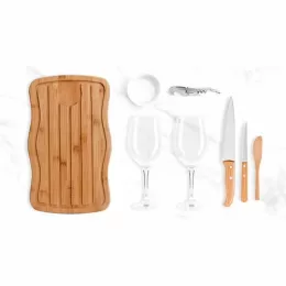 Descrição: Conta com tábua e espátula em Bambu; faca 7″ e faca de mesa em Metal/Bambu; ramekin em Porcelana; duas taças para vinho em Vidro; abridor em Metal. Produto 2 em 1, de um lado da tábua é especifica para cortar pães, do outro é ideal para queijos e petiscos. Estão perfeitamente acomodados em uma caixa para presentear.