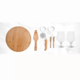 Descrição: Kit para Pizza e Cerveja Conta com tábua para petisco/pizza, espátula para pizza e duas espátulas 14cm em Bambu; cortador de pizza em Bambu/Inox; duas taças para cerveja em Vidro; dois ramekins em Porcelana. Estão perfeitamente acomodados em uma caixa para presentear.