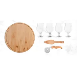 Descrição: Kit para Pizza e Cerveja Conta com tábua para petisco/pizza e espátula para pizza em Bambu; cortador de pizza em Bambu/Inox; quatro taças para cerveja em Vidro. Estão perfeitamente acomodados em uma caixa para presentear.