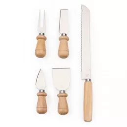 Descrição: Kit queijo com cinco peças em estojo de papelão. Contém os talheres: faca de serra, faca com ponta, espátula, garfo e faca reta.Parte interna com suporte plástico aveludado com encaixe nas formas dos talheres.