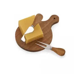 Kit queijo com 03 peças: faca, garfo e tábua de madeira com alça. Embalagem presenteável de papel kraft.