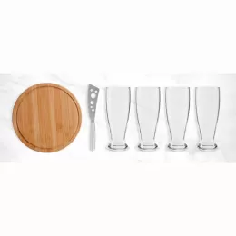 Descrição: Kit para Queijo e Cerveja Conta com tábua redonda para queijo/petisco; faca para frios em Metal; quatro copos para cerveja em Vidro. Estão perfeitamente acomodados em uma caixa para presentear.